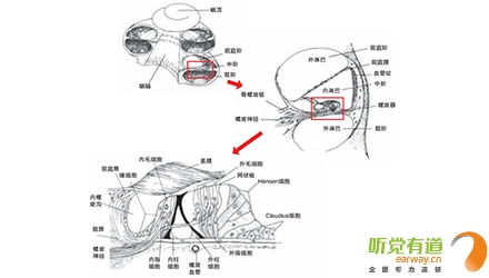 <span style="font-size:16px;"> 內(nèi)耳或稱迷路,分為三個(gè)部分:半規(guī)管、前庭和耳蝸,負(fù)責(zé)聽(tīng)覺(jué)的是耳蝸部分,外有骨殼,名骨迷路。耳蝸,顧名思義,像蝸牛殼一樣,耳蝸旋繞2.5~2.75圈。骨迷路的內(nèi)壁被骨性螺旋板分成三部分,這三部分組成了三個(gè)錐形管腔(階),外面兩層含有淋巴液,頂部是前庭階,底部是鼓階,中間較小的三角形管腔是中階,又叫膜迷路,其中含有聽(tīng)神經(jīng)末梢分支。</span></p><p><span style="font-size:16px;"> </span></p><center><span style="font-size:16px;"><img alt="" src="/upfiles/20181116011946651.png" width="440" height="250" /></span></center><p></p><p><span style="font-size:16px;"> 骨迷路(右)</span></p><p><span style="font-size:16px;"> 鐙骨底板在卵圓窗里活動(dòng),振動(dòng)了前庭階的外淋巴液。前庭階和鼓階在蝸孔相匯合,鼓階的另一端是圓窗,正好在卵圓窗和鐙骨底板的下方。中階被薄膜包裹,處于前庭階和鼓階之間,并與它們完全隔離。鐙骨底板在聲波的作用下,推動(dòng)卵圓窗,使耳蝸內(nèi)的淋巴液產(chǎn)生波動(dòng)。顳骨很硬,淋巴液的壓力不能使之產(chǎn)生任何活動(dòng),因此,當(dāng)鐙骨底板向里推動(dòng)淋巴液時(shí),淋巴液應(yīng)有一個(gè)去處,圓窗部位就是淋巴液流動(dòng)的方向。中階和前庭階有極薄的膜相隔離,而基底膜分隔中階和鼓階,基底膜是中階里螺旋器的根據(jù)地。中階的外壁由螺旋韌帶和微血管叢組成。血管叢可分泌內(nèi)淋巴液,是內(nèi)淋巴液化學(xué)成分的主要來(lái)源,內(nèi)淋巴液是維持毛細(xì)胞功能的必要物質(zhì)。基底膜上有支柱細(xì)胞、內(nèi)毛細(xì)胞、外毛細(xì)胞和膠狀蓋膜等形成的螺旋器,又名Corti’s器。</span></p><p><span style="font-size:16px;"> </span></p><center><span style="font-size:16px;"><img alt="" src="/upfiles/201811160119529073.png" width="440" height="250" /></span></center><p></p><p><span style="font-size:16px;"> 耳蝸截面圖</span></p><p><span style="font-size:16px;"> 毛細(xì)胞是聽(tīng)覺(jué)細(xì)胞,3500個(gè)內(nèi)毛細(xì)胞和12000個(gè)外毛細(xì)胞很有序的排列著。普遍認(rèn)為是外毛細(xì)胞比內(nèi)毛細(xì)胞敏感35dB,因此更容易被大聲和耳毒藥物損害。蓋膜是一種膠狀物質(zhì),內(nèi)側(cè)附在支持細(xì)胞上,其余部分覆蓋著毛細(xì)胞。毛細(xì)胞上的纖毛叢就埋在蓋膜里。淋巴液的波動(dòng)或蓋膜的運(yùn)動(dòng),可影響到毛細(xì)胞。淋巴液的波動(dòng)使蓋膜產(chǎn)生猶如鋼琴鍵般的“剪切運(yùn)動(dòng)”,刺激毛細(xì)胞底部的神經(jīng)末梢,產(chǎn)生神經(jīng)沖動(dòng)。耳蝸底部,離卵圓窗最近處,對(duì)高頻發(fā)生響應(yīng),耳蝸?lái)敳浚催h(yuǎn)離卵圓窗的地方,對(duì)低頻發(fā)生響應(yīng),中頻響應(yīng)介于頂和底之間。</span></p><p><span style="font-size:16px;"> 更多詳情請(qǐng)登錄m.zqsjzx.cn</span></p>" />