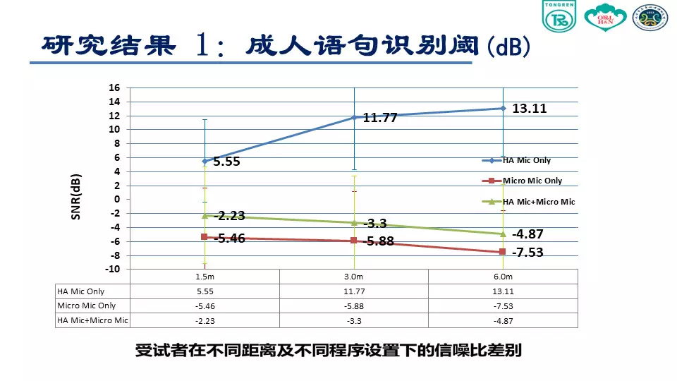 我們可以看到,單獨使用助聽器麥克風情況下,言語識別閾從1.5m處的5.55 dB上升到6m處的13.11 dB。單獨使用迷你麥克風和使用迷你麥克風同時開啟助聽器麥克風這兩種情況下受試者言語識別閾隨距離變化不大。