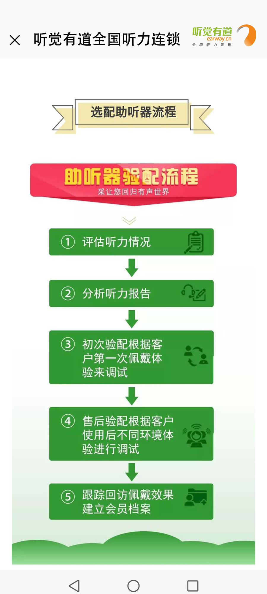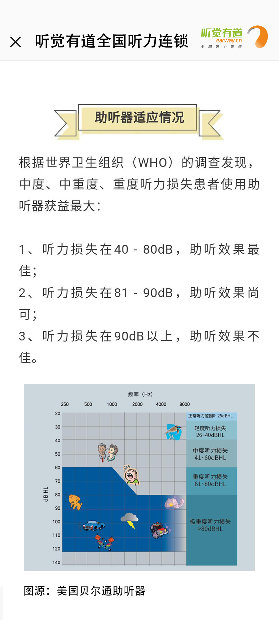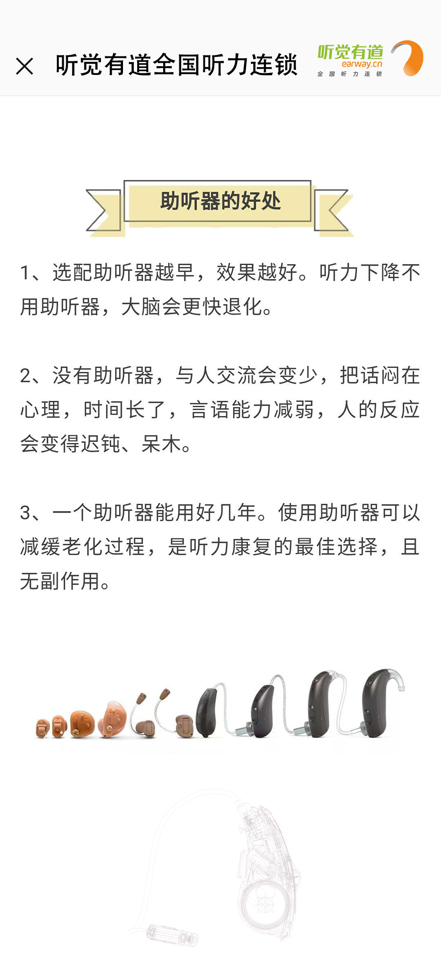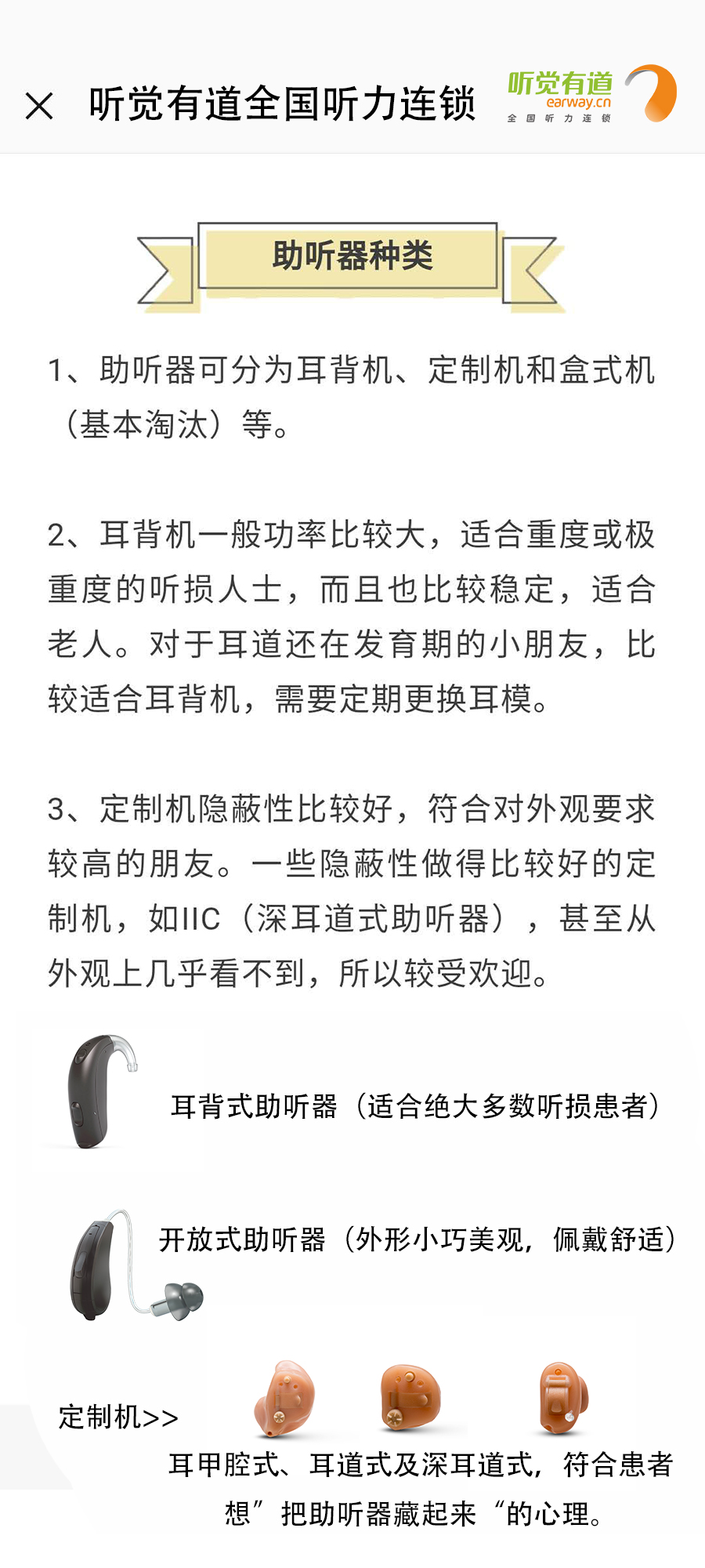 什么是助聽(tīng)器?長(zhǎng)什么樣子?有什么作用?如何使用?這里一一告訴您!</p><p> 助聽(tīng)器是聽(tīng)力障礙者使用的輔具,用來(lái)補(bǔ)足聽(tīng)力損傷所造成的缺陷。廣義上講凡能有效地把聲音傳入耳朵的各種裝置都可以看作為助聽(tīng)器,狹義上講助聽(tīng)器是一個(gè)電聲放大器,通過(guò)它將聲音放大,使聽(tīng)障者聽(tīng)到了原來(lái)聽(tīng)不清楚、聽(tīng)不到的聲音。</p><p> 第一:助聽(tīng)器的種類</p><p style="text-align: center;"><img src="/upfiles/201901180318143583.jpg" width="640" alt="" /><br /></p><p> 第二:助聽(tīng)器的好處</p><p style="text-align: center;"><img src="/upfiles/201901180318334139.png" width="640" alt="" /><br /></p><p> 第三:如何適應(yīng)助聽(tīng)器</p><p style="text-align: center;"><img src="/upfiles/201901180318506440.jpg" width="640" alt="" /><br /></p><p> 第四:選配助聽(tīng)器流程</p><p style="text-align: center;"><img src="/upfiles/201901180319039646.jpg" width="640" alt="" /><br /></p><p style="text-align: center;"><br /></p><p> 更多詳情請(qǐng)登錄m.zqsjzx.cn</p>" />