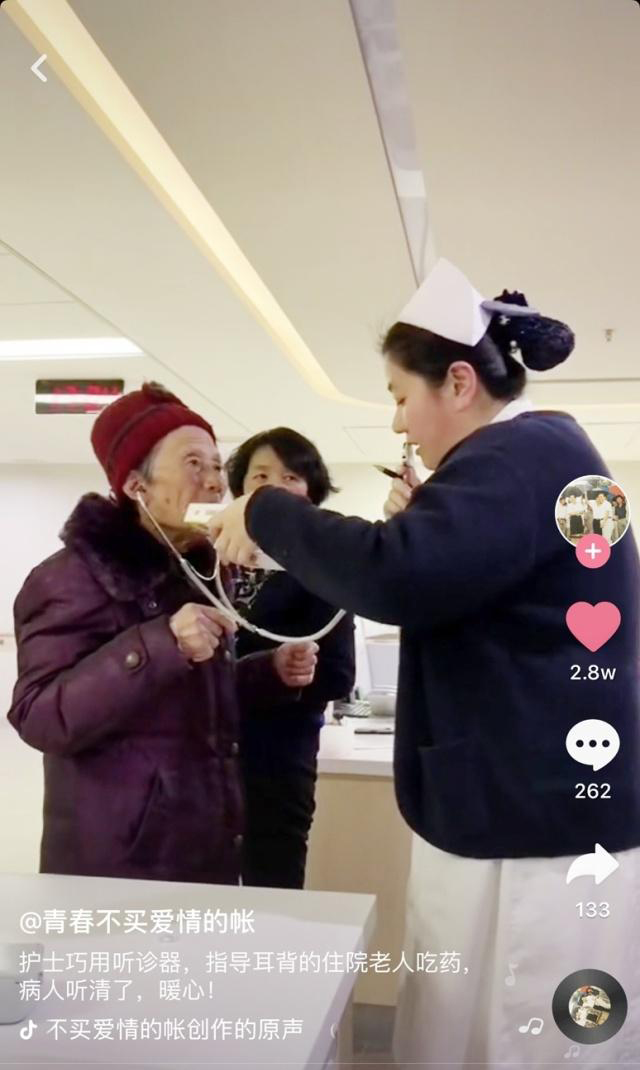 友好醫院工作人員把這段視頻做成一條抖音視頻,以網名“青春不買愛情的帳”發送。“青春不買愛情的帳”說,本來就想與同事和朋友分享一下醫院護士既機智又暖心的行為,沒想到僅一天的工夫,竟獲百萬點擊量,數萬個贊。