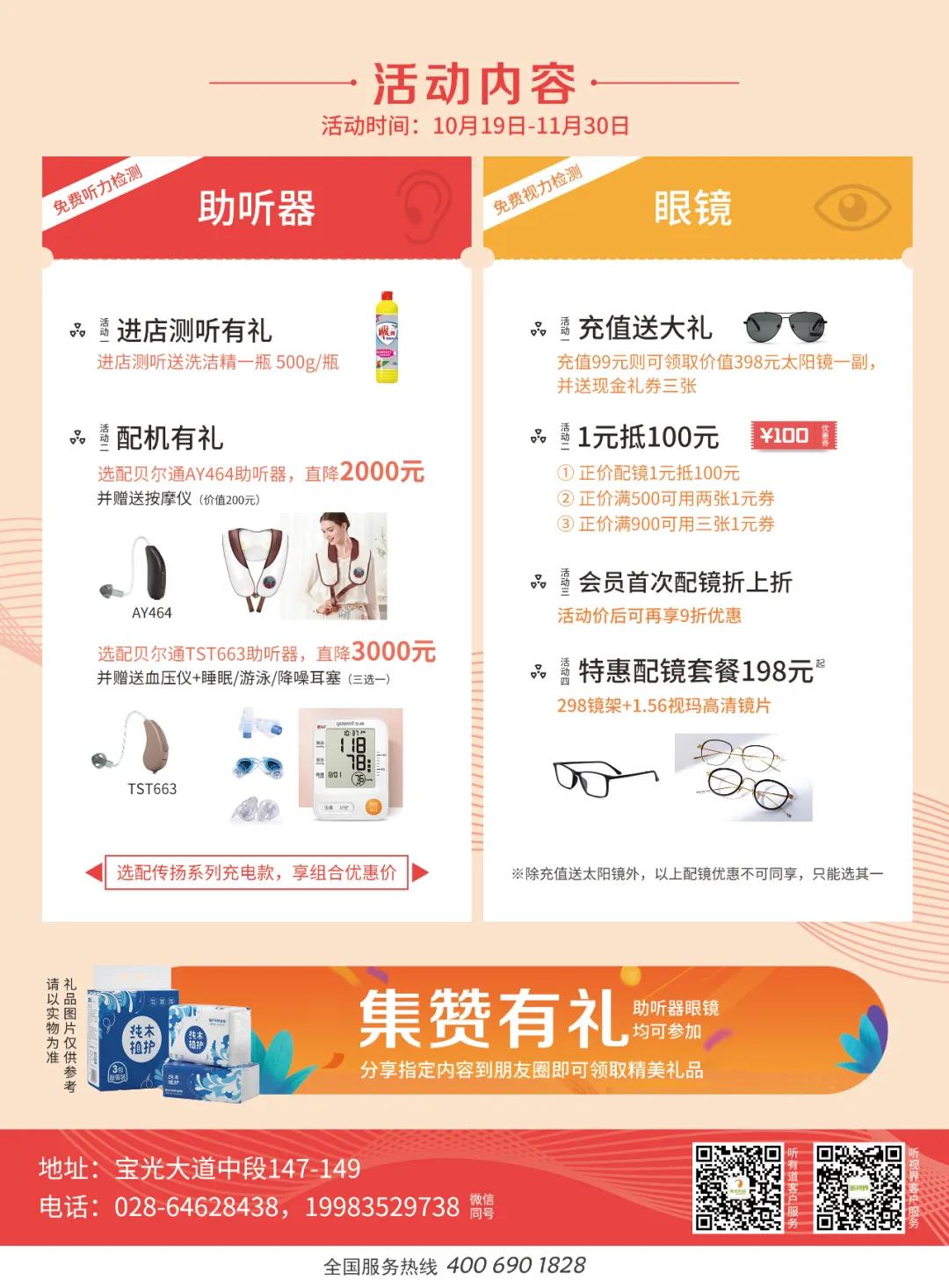 活動內容包括:測聽有禮、助聽器配機有禮、眼鏡充值送大禮、配鏡1元抵100元、會員首次配鏡折上折、特惠配鏡套餐198元起、朋友圈集贊有禮等。