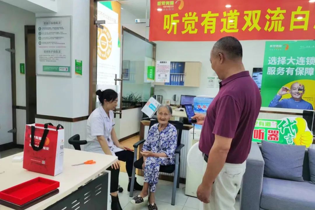 年紀(jì)輕輕的孫子,已和長(zhǎng)輩一般高,牽著滿(mǎn)頭白發(fā)的爺爺前來(lái),為他配上了助聽(tīng)器。