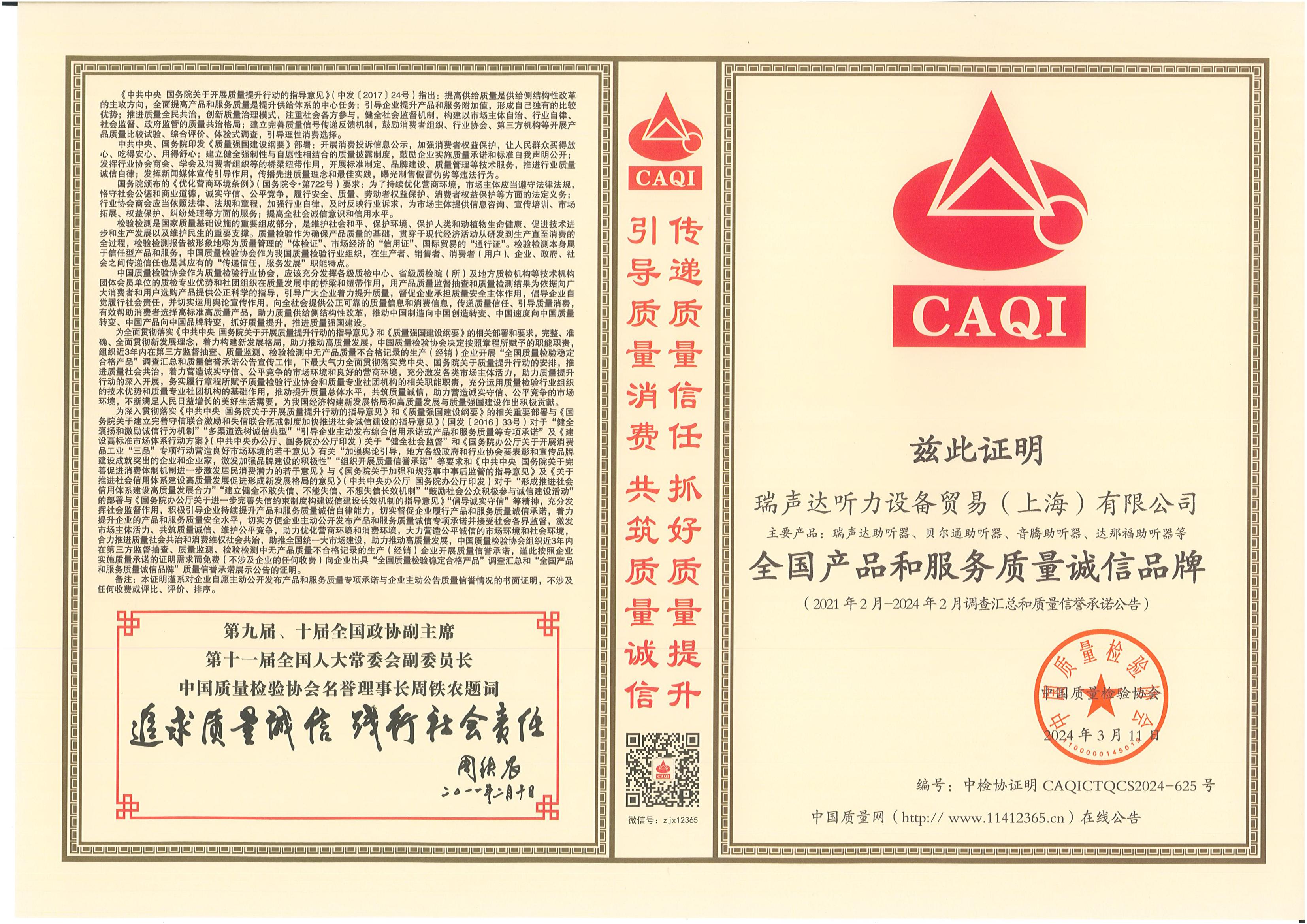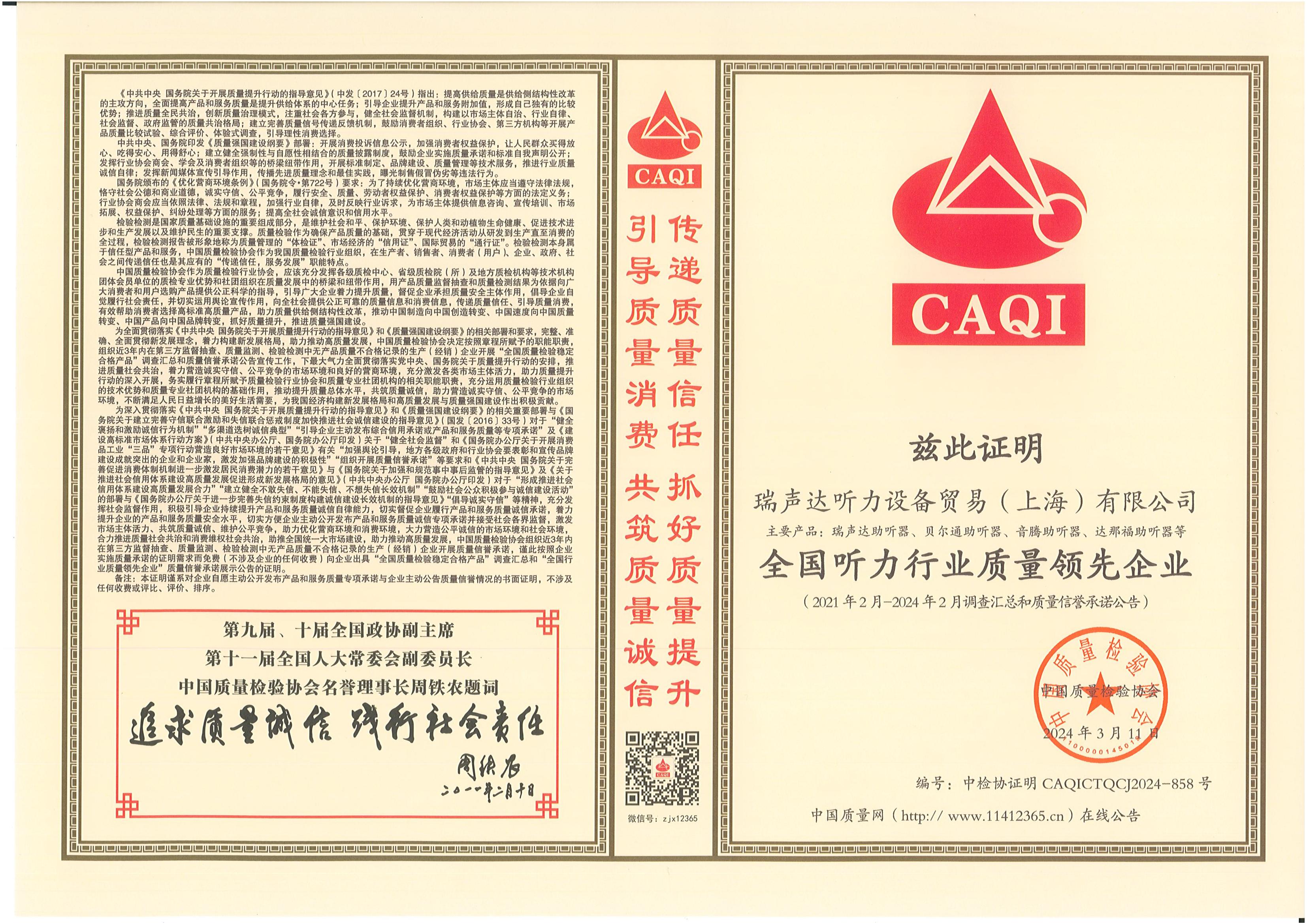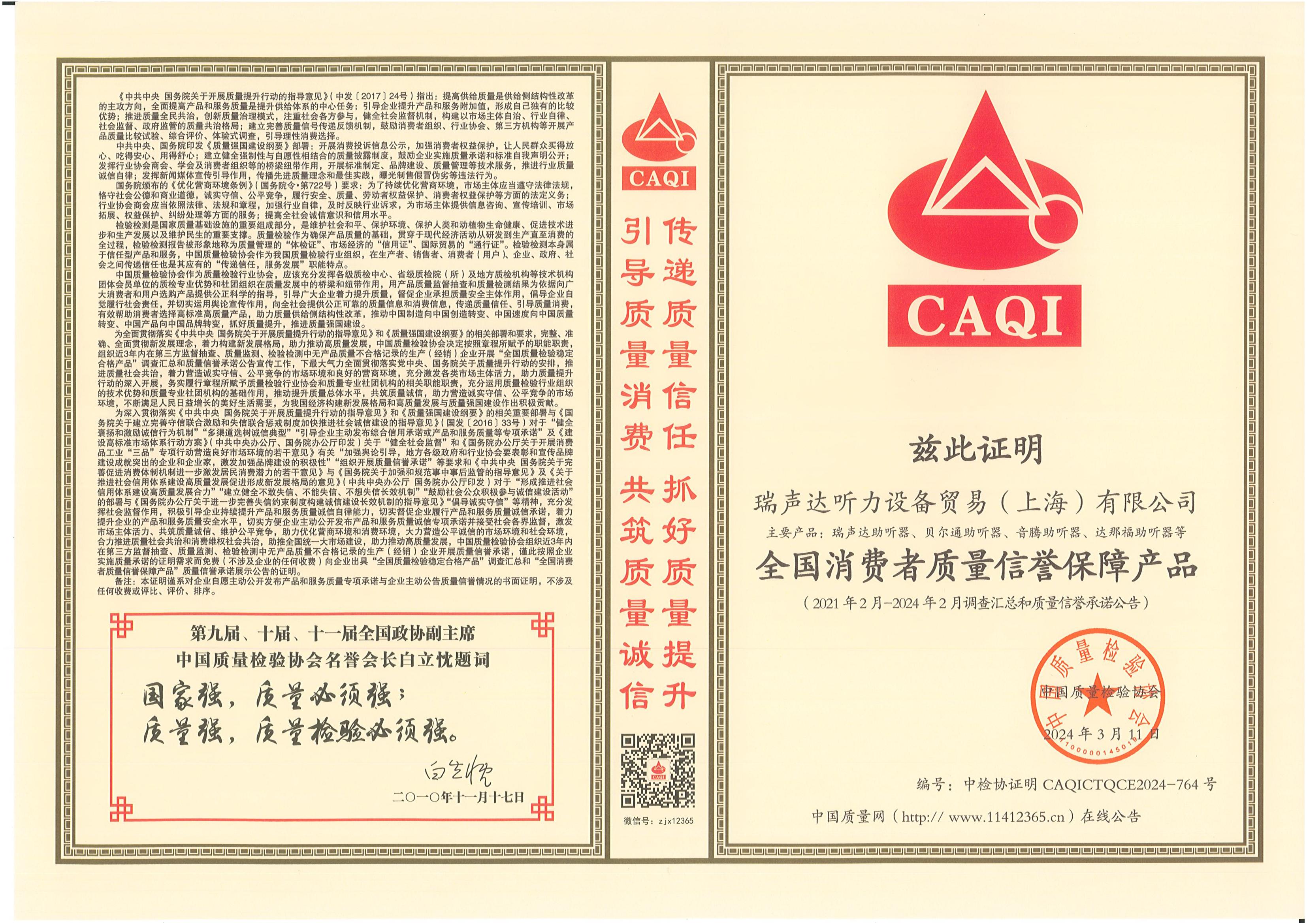 作為對貝爾通助聽器產品的肯定,2024年中國質量檢驗協會再次頒發了四項榮譽證書,以期能引導用戶選擇高標準高質量的產品,優化消費環境,保護消費者權益。